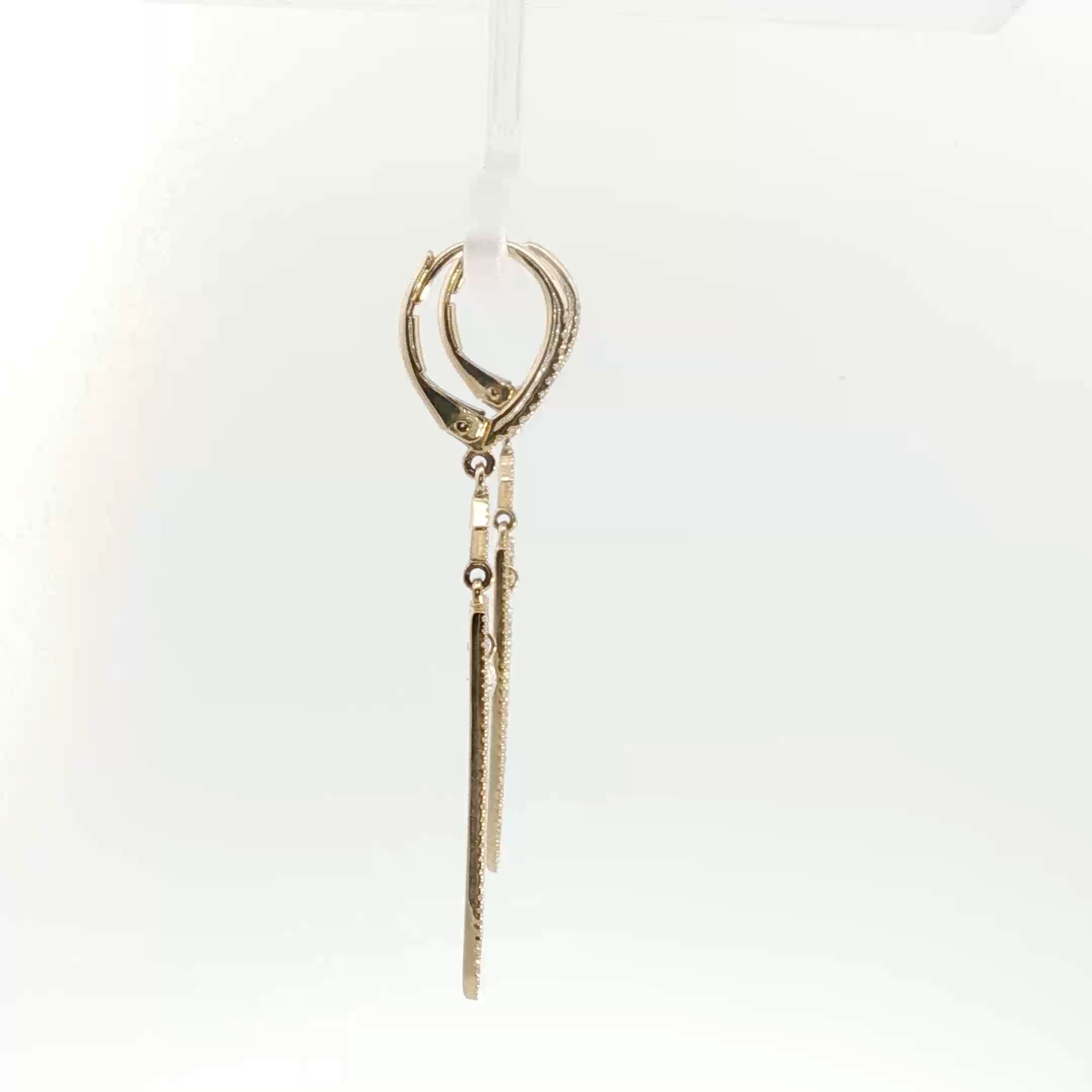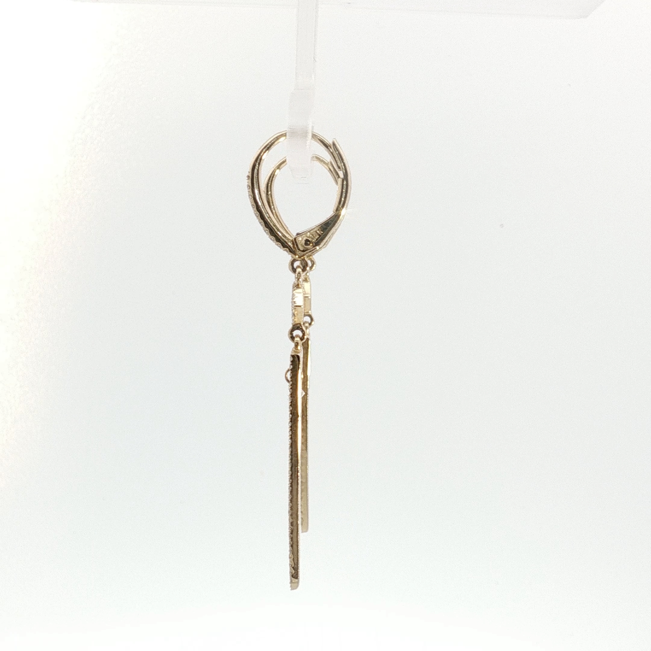 Elevate your style with these elegant dangle earrings. Crafted from lustrous 14k yellow gold, the earrings feature a brilliant round cut diamond suspended within an elongated, diamond-accented triangular frame. The secure lever-back closures ensure comfortable and worry-free wear, making them the perfect accessory for both everyday elegance and special occasions. Total Diamond weight .60 of Natural Diamonds.